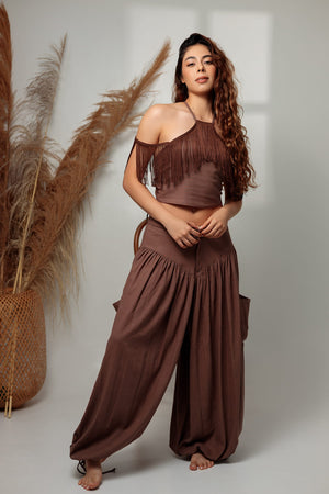 Un top halter que combina sensualidad y movimiento en cada detalle. Su escote cerrado al frente contrasta con una espalda descubierta adornada con un lazo central, añadiendo un toque inesperado y seductor. Los flecos largos que caen de los hombros aportan fluidez, haciendo de esta pieza el centro de atención en cualquier ocasión.
