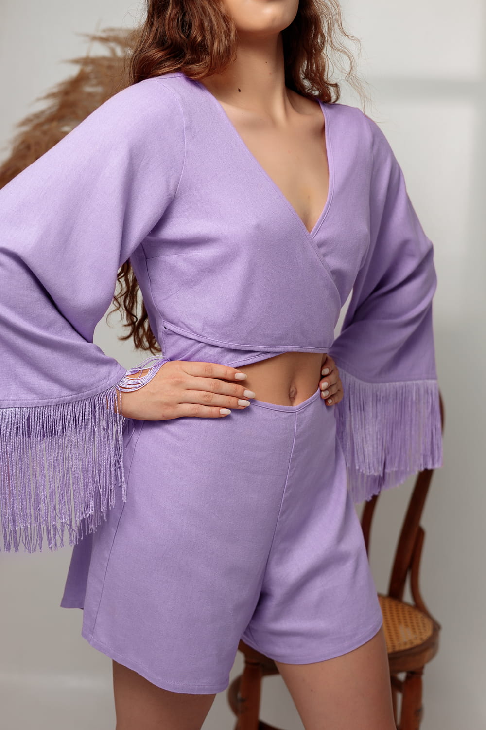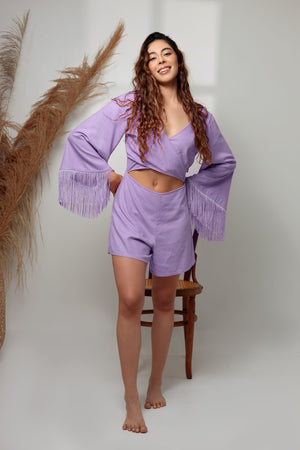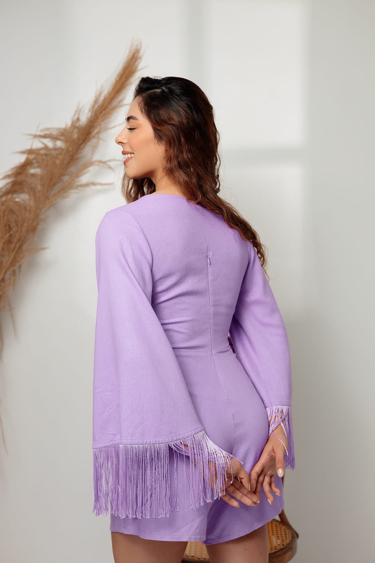 Un jumper diseñado para robar miradas y transmitir libertad. Su escote cruzado y ajustado al torso crea una figura estilizada y femenina, mientras las mangas amplias con flecos en los puños añaden un toque de movimiento y sofisticación bohemia. El corte fluido de los shorts asegura comodidad y elegancia en cada paso, haciendo de esta prenda una elección ideal para ocasiones especiales o días llenos de estilo.