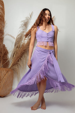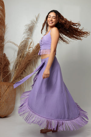 Una falda envolvente que captura el movimiento y el encanto del estilo bohemio. Su borde trenzado artesanalmente y los flecos largos en el contorno aportan detalles únicos, mientras que el lazo ajustable permite personalizar el ajuste. Su diseño asimétrico y fluido garantiza comodidad y sofisticación en cualquier ocasión.